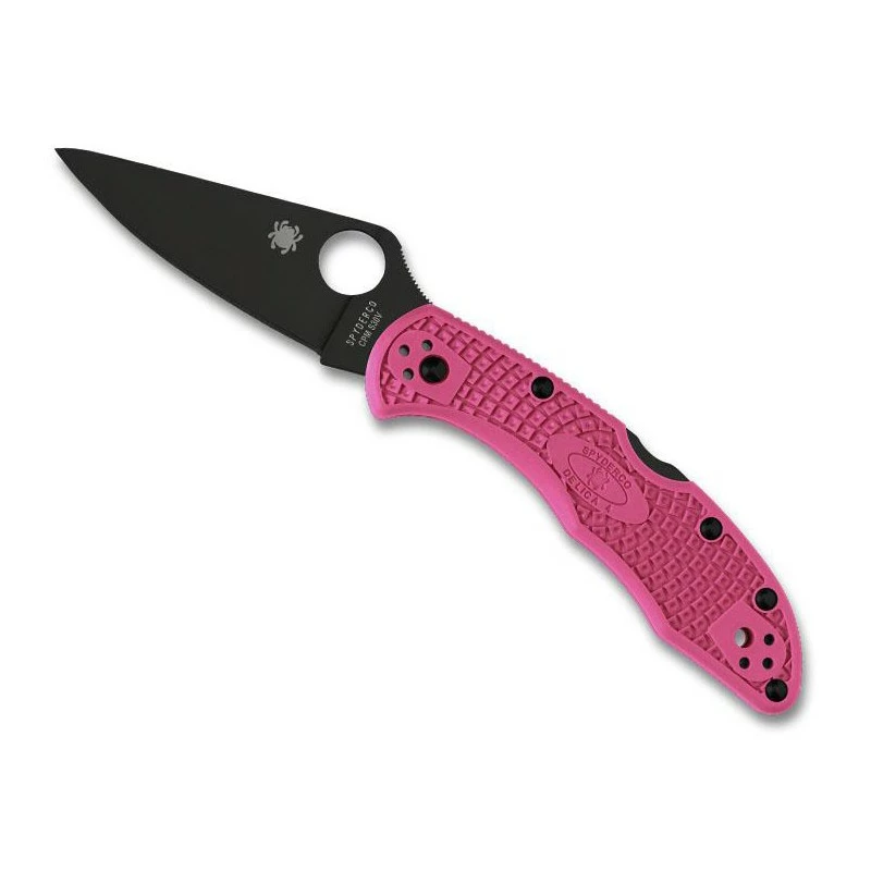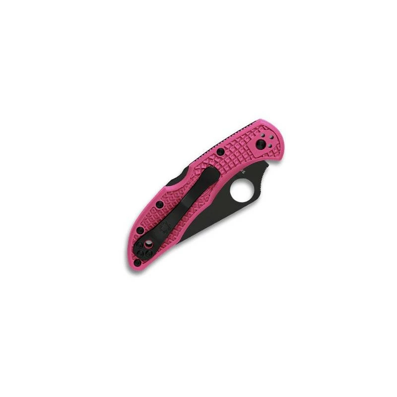 Ce couteau Spyderco C11FPPNS30VBK est des plus étonnants, ou encore audacieux si vous préférez. Il s’agit du très populaire modèle Delica 4 présentant une belle association de couleurs. Il fallait oser utiliser le rose pour le manche en même temps que le noir pour la lame, mais avouez que le résultat est des plus spectaculaires. Ce couteau Spyderco Delica 4 rose possède une lame de 108mm en acier CPM-S30V avec revêtement noir nitrure de titane, elle est ajourée, à profil plat, et à mécanisme de verrouillage back lock. La poignée mesure elle 11cm de long ce qui confère une facilité de transport certaine, elle est fabriquée en nylon et fibre de verre rose que l’on appelle FRN. En plus d’être élégant, ce matériau est ergonomique en procurant un grand confort de prise en main, tout en apportant une bonne solidité, résistance. Un clip de poche noir à quatre positions est présent au dos de la poignée pour faciliter le transport du couteau, sa couleur assure une belle harmonie avec l’ensemble.