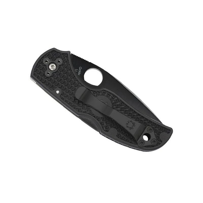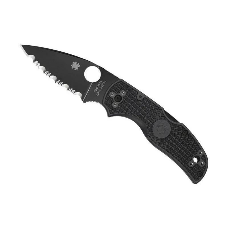 Voici la version complètement noire du couteau pliant Spyderco Native 5. Il possède une lame à dents et à cran conçue en acier inoxydable CPMS35VN avec revêtement DLC noir. Décorée du logo Spyderco, la lame crantée est très pratique pour tout trancher lors des aventures et excursions : notamment des branchages, de la ficelle ou des petites cordes. La lame est marquée du texte “Spyderco CPMS35VN” et est également munie d’un trou, c’est en quelque sorte la marque de fabrique de la coutellerie Américaine. Également de couleur noir, le manche est lui conçu en FRN, un mélange de nylon et de fibre de verre assurant élégance et robustesse. Ce couteau pliant est facile à transporter en raison de sa petite taille (10cm en position fermée), son faible poids et son clip de poche au dos. Le couteau Spyderco Native 5 C41SBBK5 a un look spectaculaire de part sa finition DLC : il ne vous décevra jamais !