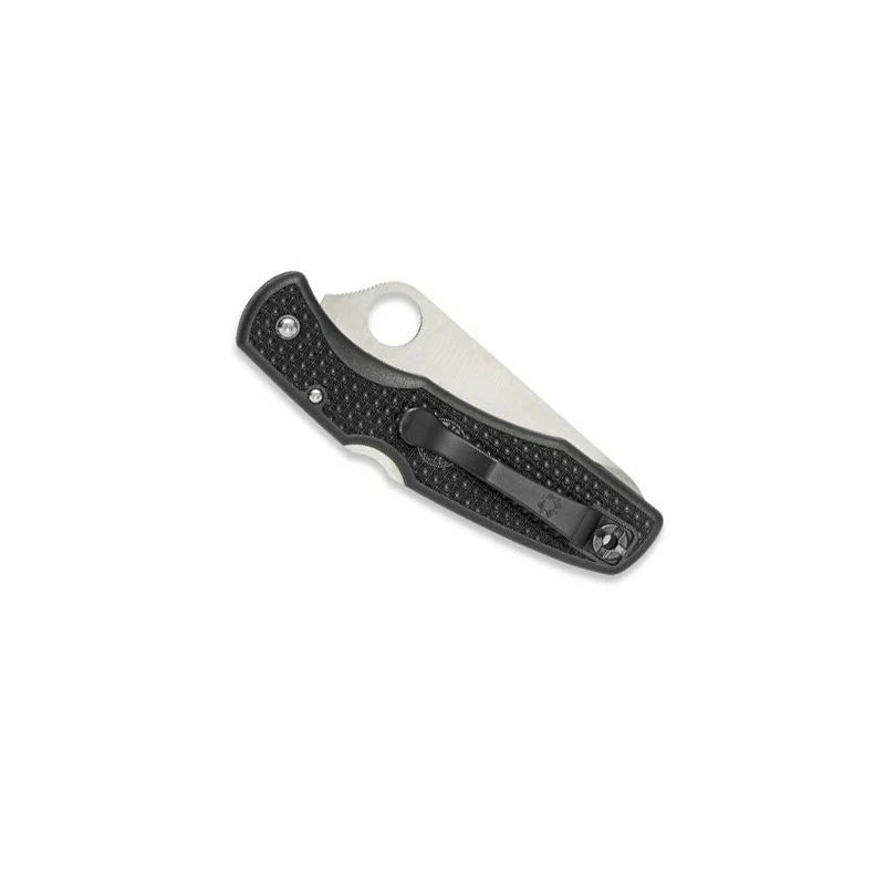 Le couteau Spyderco Pacific Salt référence C91PBK est doté d’une lame fabriquée avec le nouvel acier H-1. Un acier trempé utilisant 0,1% d’azote ce qui lui permet d’atteindre 57-58rc sur l’échelle Rockwell mesurant la dureté de la lame. Un excellent score qui témoigne de la très grande robustesse et solidité de la lame ! Elle est tranchante, décorée par le texte H1 en référence au type d’acier utilisé, et toujours ajourée du gros trou caractéristique de la marque Américaine Spyderco. Notez bien que comme d’habitude, la lame du couteau Spyderco Pacific Salt C91PBK est personnalisable par gravure (voir bouton ci-dessous). Le manche lui est fabriqué en FRN noir (alliage de nylon et de fibre de verre), un matériau plébiscité par Spyderco en raison de son excellent rapport robustesse/design. La poignée mesure exactement 125mm de longueur ce qui garantit une facilité de transport au quotidien. Facilité de transport accentuée par le fait que le manche intègre un clip de poche au verso. Design, performance, robustesse, ce couteau pliant Spyderco Pacific Salt noir a tout pour plaire !