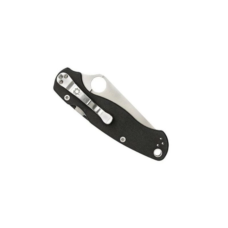 Muni de la référence C81GP2, ce couteau pliant Spyderco Para Military 2 se distingue de part son manche noir en G10 de longueur 12cm. C’est une couleur plus sobre, ou plus “passe partout” que celle que l’on trouve chez son frère le Spyderco Para Military 2 camo. Grâce au clip de poche au dos du manche noir, le Spyderco Para Military 2 noir est facile à transporter : il accompagnera facilement les militaires ou aventuriers sur le terrain. Au niveau de la lame, pas de changement, elle est aussi fabriquée en acier inoxydable CPM-S30V avec mécanisme de verrouillage “Compression Lock”. Mesurant 8,7cm de longueur, la lame est munie d’un bout pointu ainsi qu’un trou pour l’ouverture à une main. Elle est décorée par le motif Spyderco et se personnalise par un texte (+8,90€). L’autre avantage, c’est qu’elle bénéficie d’une excellente résistance face à la corrosion.