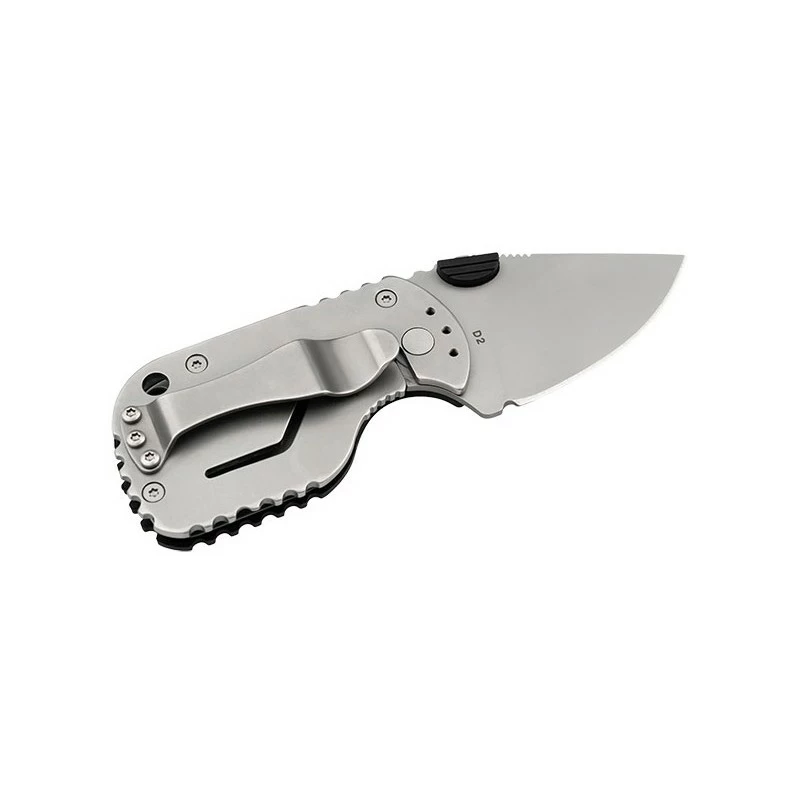 Le Böker Plus Subcom noir 2.0 possède une courte lame en acier D2, à la finition microbillée, se verrouillant efficacement via le mécanisme frame lock. Elle est relativement simple à déployer grâce au bouton de pouce prépondérant présent sur chacune des deux faces.