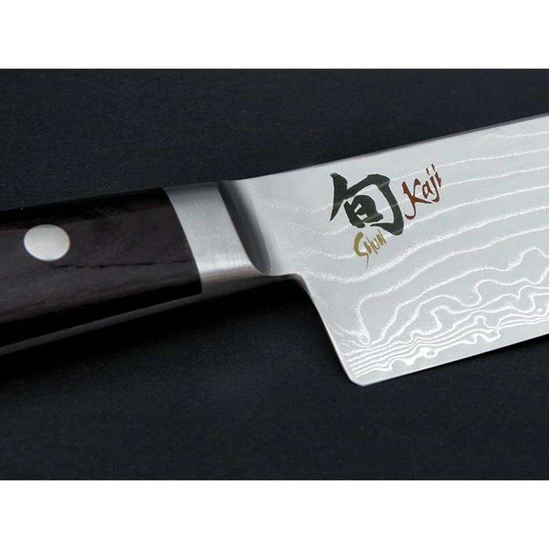 Ce couteau de cuisine Kai Shun Kaji est universel, autrement dit il est très polyvalent et convient pour de nombreuses découpes. C’est un couteau Japonais qui est muni d’une lame de 12cm de long en acier damas 32 couches, avec un noyau central en acier SG2 à la dureté élevé (environ 64 selon l’échelle Rockwell). Munie d’une splendide finition poli glace, la lame damas est décorée de vagues ainsi que par l’inscription Kaji. Rappelons que la série Shun Kaji par Kai est de très haute gamme et convient parfaitement pour les professionnels.