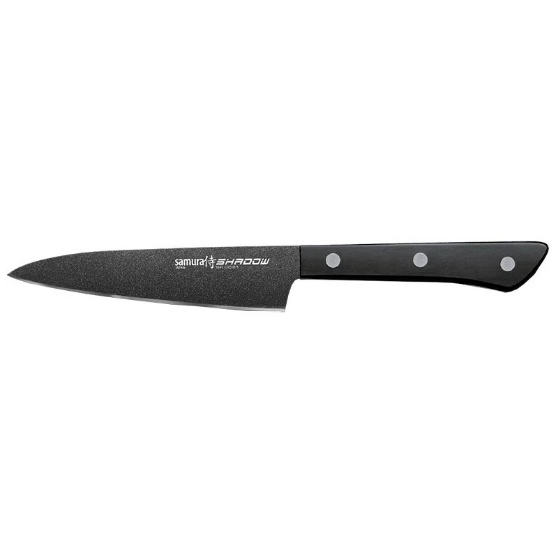 Le Shadow Samura est un couteau utilitaire au design moderne qui s’harmonisera avec tout type de cuisine. Sa lame avec revêtement antiadhésif noir empêche que les aliments ne restent coller dessus. D’une longueur de 12 cm, elle est fabriquée en acier inoxydable AUS-8 qui conserve très bien le tranchant et offre une ténacité supérieure. Le manche noir en ABS dispose d’une forme ergonomique qui facilite sa prise en main. Le couteau de cuisine Shadow Samura est polyvalent : il est idéal pour la découpe de viandes, de légumes, de fruits, de poissons. Nettoyage à la main.