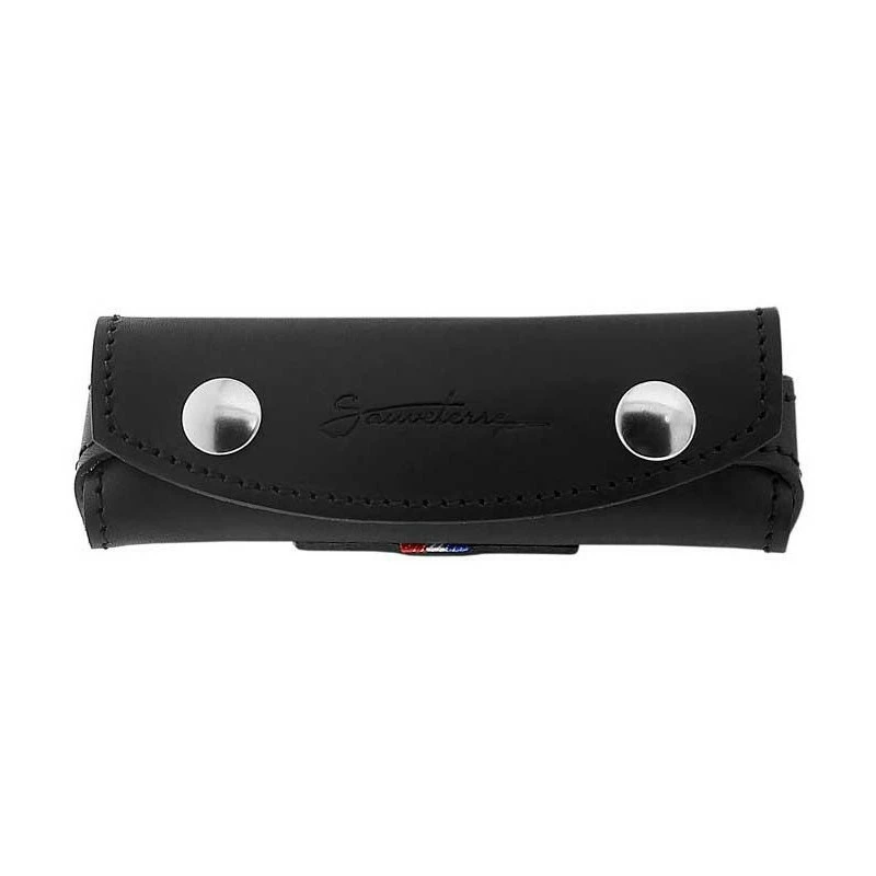 Réalisé en cuir bovin pleine fleur, coloris noir, ce bel étui est doté d’un passant horizontal afin de pouvoir être fièrement porté à la ceinture et vous accompagner durant le moindre de vos déplacements. La fermeture se fait de façon très simple, à l’aide des deux boutons pressions. On soulignera la présence de l’inscription “Sauveterre” entre les deux pressions.