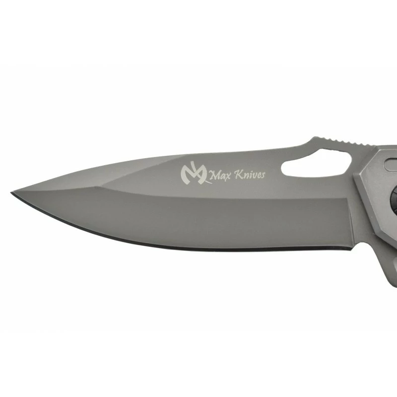 Le Max Knives MK145 est un couteau pliant qui possède une lame de 95mm de long, en acier 3Cr13 avec revêtement noir, un acier inoxydable résistant à la corrosion/rouille. La lame est embellie par le logo Max Knives, on soulignera la présence d’un thumb hole ainsi que flipper pour faciliter l’ouverture, le déploiement de la lame. Il est possible de venir graver la lame au niveau des deux faces, par procédé gravure.