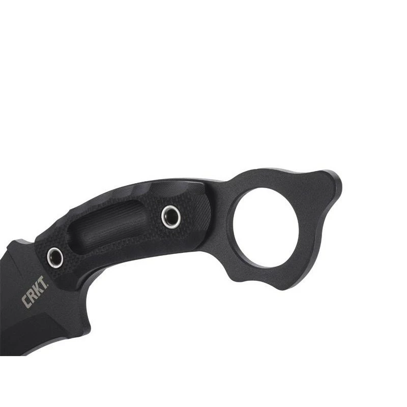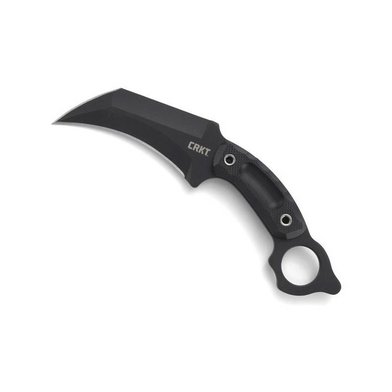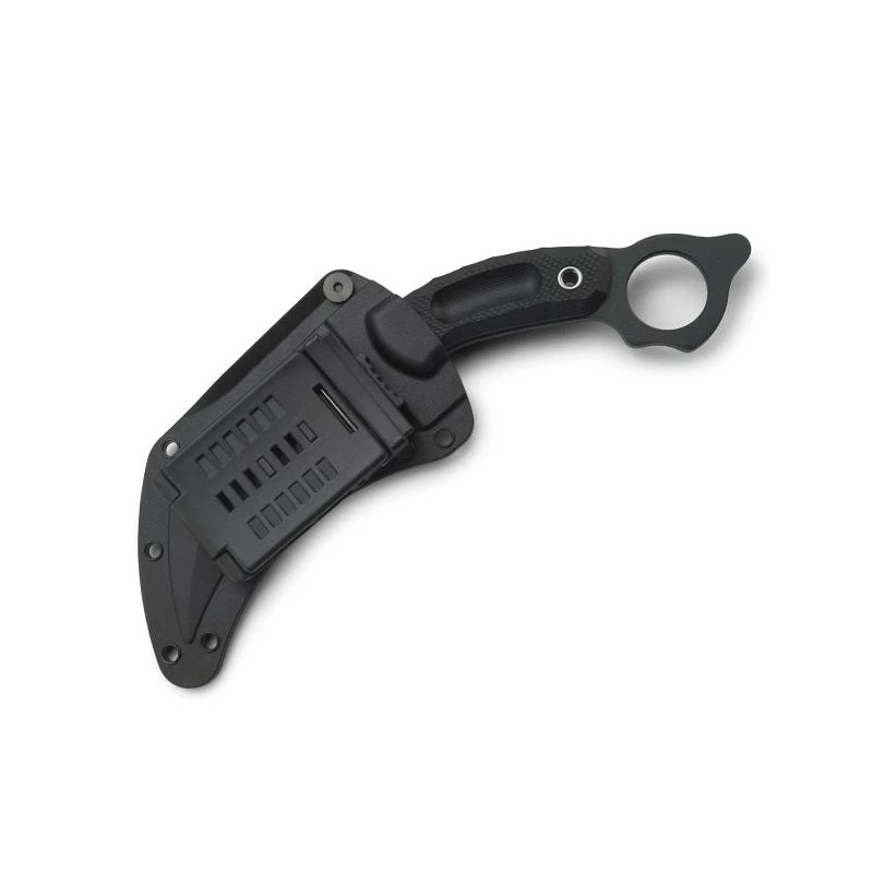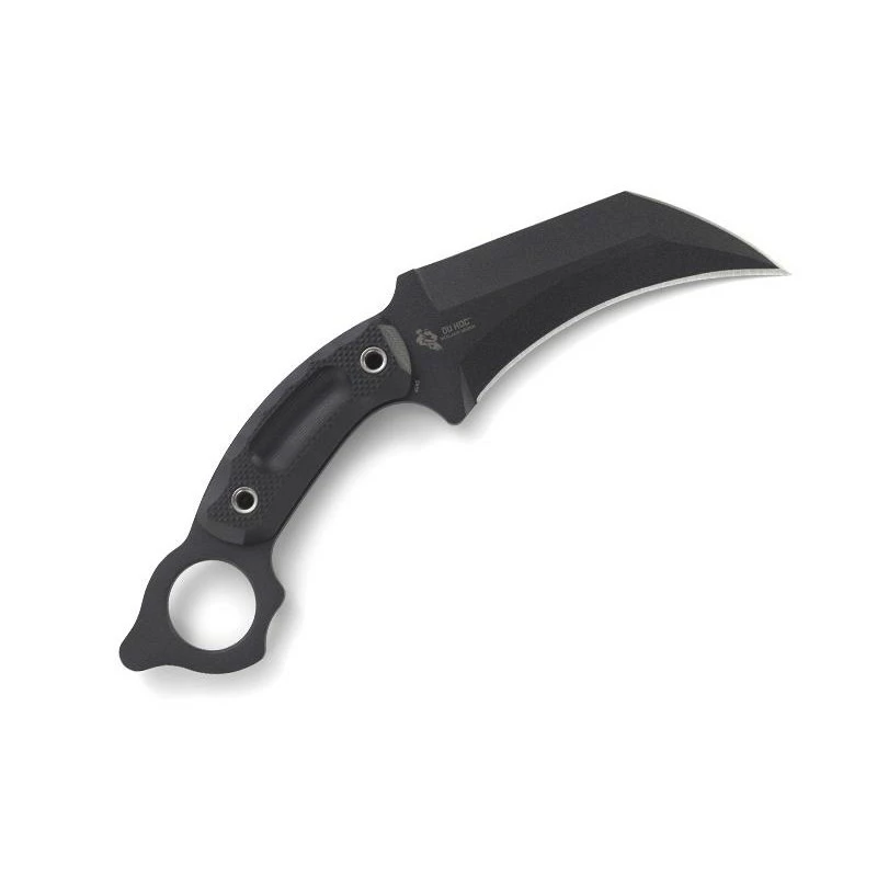 Le Du Hoc CRKT est un colossal poignard fixe, de type karambit, conçu par Austin McGlaun. Son gabarit est assez impressionnant puisqu’il mesure tout de même environ 245mm de long. Idéal pour le self-defense, le Du Hoc 2630 est doté d’une lame à double tranchant, de 125mm de long, en acier SK5 avec revêtement noir anti-corrosion et non-réfléchissant pour l’usage tactique. Puissante et tranchante, la lame est recourbée, à la façon d’un karambit, on observe également qu’elle est marquée par le logo CRKT (Columbia River Knife & Tool). À noter que la lame carbone est fortement enrichie en manganèse. La poignée est fabriquée en G10 noir, elle est texturée et offre une excellente adhérence, prise en main, par tous les temps, ou encore toutes les conditions météorologiques. Un anneau de pouce est présent au bout de la poignée. Le poignard CRKT Du Hoc est livré avec un étui en nylon renforcé de verre noir avec clip compatible MOLLE, grâce à lui, le transport sera beaucoup plus simple !