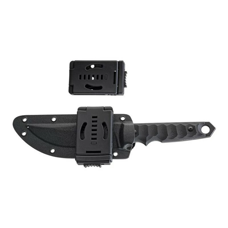 Le poignard Fox Production Ryu FX.634 est un couteau fixe aux dimensions relativement imposantes. Sa longueur totale est de 27cm, notez bien qu’il s’agit d’une réalisation de Black Roc Knives. La lame de 13cm présente une finition blackwash (revêtement Idroglider noir), elle est fabriquée en acier Niolox à la dureté HRC d’environ 60. Dans le coin supérieur droit, on peut voir le logo Fox Production qui n’est autre qu’une tête de renard colorée en blanc pour le contraste. La poignée est fabriquée en G10 noir, elle est texturée pour le style mais aussi pour que la tenue en main soit plus agréable, plus confortable, et ce, même lors des utilisations prolongées. Un large trou est présent en bout de manche, il sera aisé d’y passer un cordon dans l’optique de simplifier les déplacements. Le poignard Fox Production Ryu FX.634 vous sera livré avec son étui de type kydex.