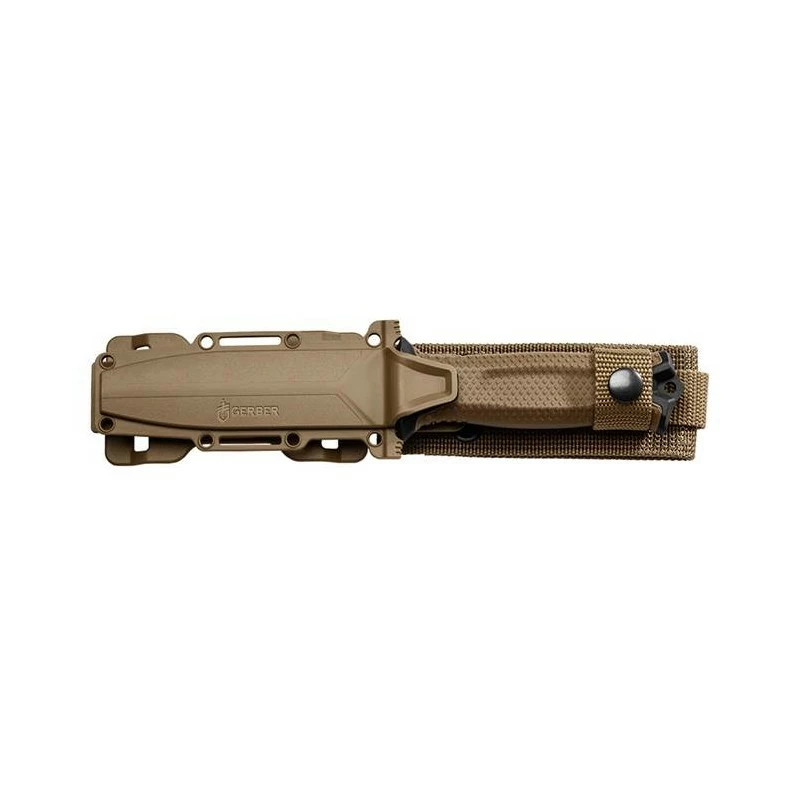 Parfait pour l’aventure, l’usage tactique ou militaire, le poignard Gerber StrongArm Coyote Tan, GE001058, est aussi muni d’un manche en GFN avec texture diamantée améliorant considérablement la qualité de la prise en main qui est à la fois ferme et sûre. On notera la présence d’un petit trou de lanière en bout. Le type d’ouverture est fixe avec garde.