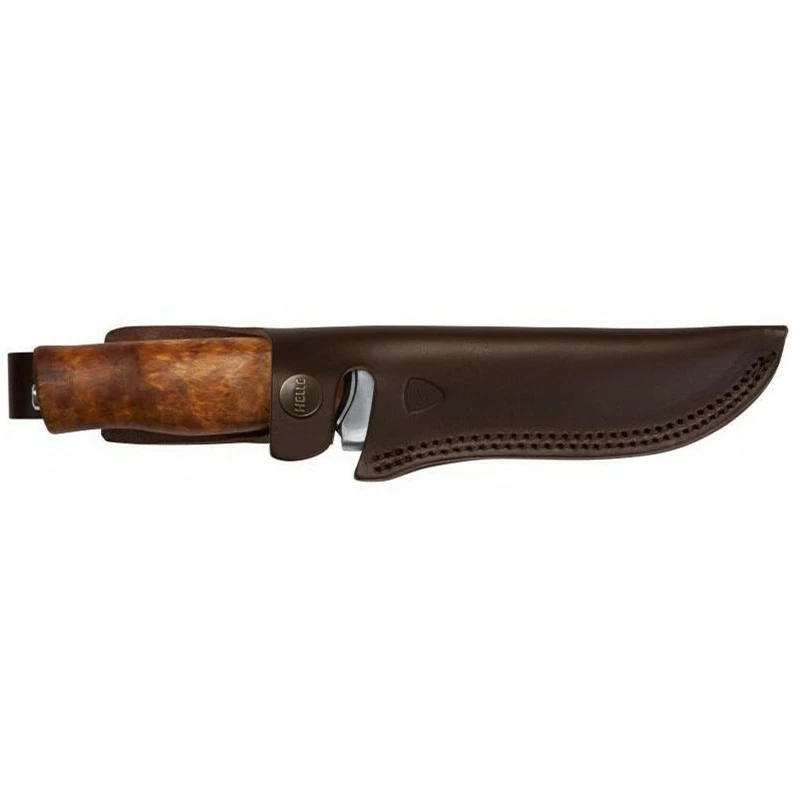 Pratique, le poignard Helle GT H036 est vendu avec sa gaine en cuir marron avec une fermeture par bouton pression. Afin de transporter/protéger le couteau avec toujours plus de facilité !