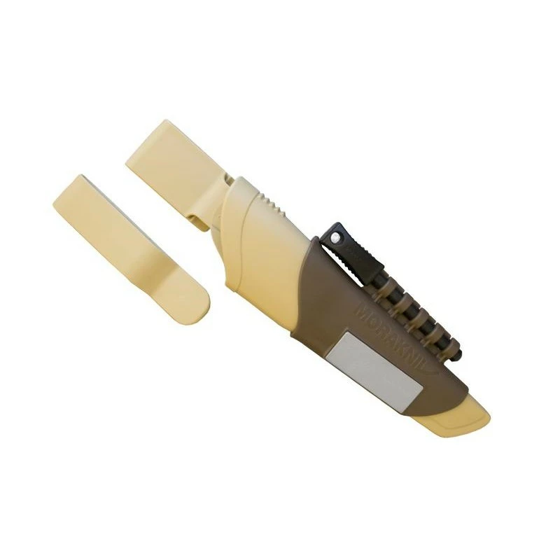 Avec son manche marron/sable en gomme, ce poignard Morakniv Bushcraft Survival (référence 13033) sera en parfaite harmonie avec l’environnement qui vous entoure. Comme son nom l’indique, c’est un couteau Mora spécialement conçu pour le bushcraft (survie en pleine nature). Il est d’ailleurs livré avec un étui rigide coloris marron/sable, un aiguiseur diamant ainsi qu’un allume-feu fire-starter. Un allume-feu qu’il faudra frotter fermement le long du dos de la lame de 11cm en acier inoxydable (résistante à la corrosion/rouille). Il faut souligner le fait que la lame est marquée au recto par le logo de la coutellerie Suédoise Morakniv. Possibilité de la graver au niveau des deux faces (voir bouton ajouter une gravure). Avec un design à la fois discret et stylé, le poignard Mora Bushcraft Survival desert inox est le couteau à lame fixe pour les baroudeurs, aventuriers et mordus de bushcraft. Existe en d’autres coloris.