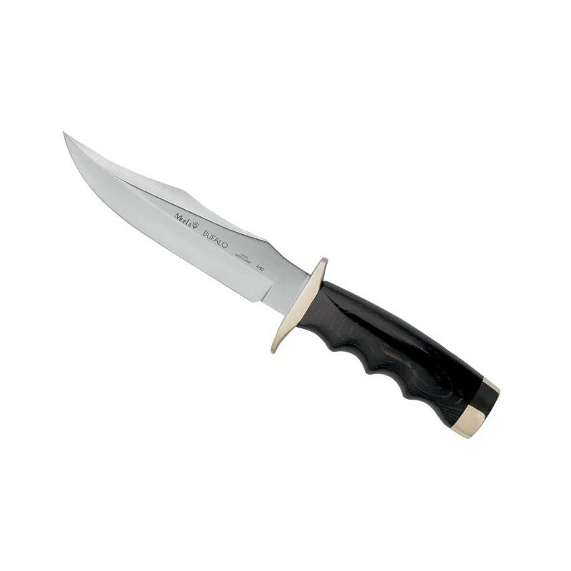 Voici la version “manche en micarta noir” du poignard Muela Bufalo. Une couleur plus classique qui séduira un plus grand nombre d’amateurs. Le manche du Muela Bufalo est très esthétique en raison de son coloris noir (micarta) mais aussi doré sur les extrémités (dont la garde de sécurité limitant les risques de blessures), monture maillechort. Avec un design discret mais élégant, le manche est aussi très ergonomique en offrant au chasseur ou aventurier une prise en main des plus confortables. Ce poignard Muela Bufalo 9257, c’est aussi une lame de longueur 17cm en acier inoxydable avec pointe orientée vers le haut. À la fois tranchante et résistante (notamment face à la corrosion ou rouille), la lame de 17cm est marquée par le nom du poignard, à savoir le Muela Bufalo. Transporter et prendre soin du poignard sera très facile grâce à la présence d’un étui en cuir de grande qualité (voir les autres images du produit).