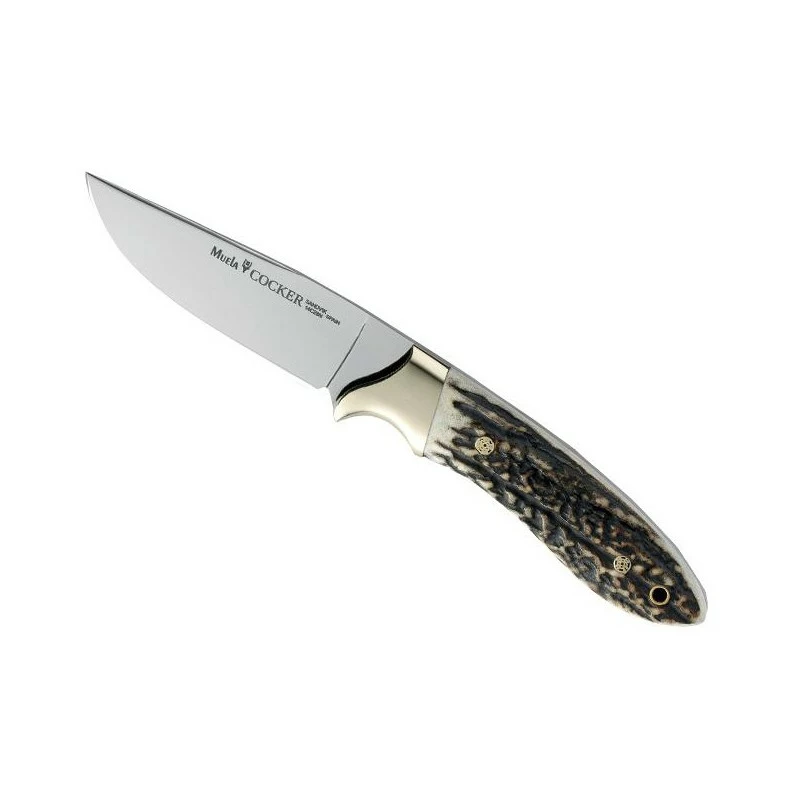 Le Muela Cocker 9293 est un poignard qui ne passera pas inaperçu de part son manche fabriqué en bois de cerf véritable avec vis mosaïque. En plus d’être solide, le manche est aussi très esthétique avec un design très authentique. Le plus incroyable dans tout cela, c’est que la prise en main du poignard reste tout de même très confortable, même en cas d’utilisations intensives. À noter que le bois de cerf véritable est un matériau très apprécié des chasseurs. Le poignard Muela Cocker dispose aussi d’une lame de longueur 11cm fabriquée en acier 14C28N (lame de haute dureté et de bonne résistance à la corrosion). On peut d’ailleurs apercevoir sur la lame le nom du poignard, ici le Cocker, accompagné du logo Muela. Le pays de fabrication est aussi mentionné par l’intermédiaire du “Made in Spain” indiquant une fabrication Espagnole. Rappelez-vous que la lame du poignard Muela Cocker 9293 est soumise à la personnalisation au niveau des deux faces (procédé gravure). Comme très souvent, ce modèle est vendu avec son étui de protection en cuir Muela (voir photos du produit pour aperçu).