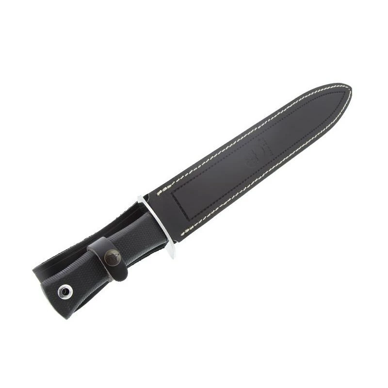 Le Muela ESCORP 9312 est un poignard doté d’une grande lame de 30cm de longueur fabriquée en acier inoxydable X50CrMoV15 (teneur en carbone 0,5%, et 15% en chrome). Une lame extrêmement puissante qui conviendra notamment pour la chasse : elle est aussi très résistante face à la rouille ou corrosion. N’oubliez pas que la grande lame est personnalisable par gravure au niveau des deux faces (avant/arrière), voir le bouton “ajouter une gravure” pour plus d’informations. Il faut aussi souligner la présence d’une garde en inox. Ce poignard Muela ESCORP 9312 dispose aussi d’un manche en gomme noire antidérapant : il assure une prise en main confortable et sûre pour des maniements du poignard toujours très aisés. Un allié de choix pour tous les chasseurs, d’autant plus que le poignard Muela ESCORP 9312 est livré avec son étui de protection en cuir noir signé Muela.