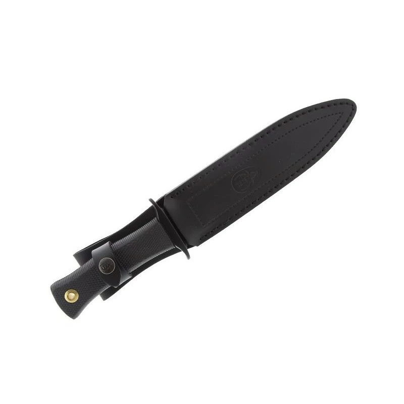 Le Muela ESCORP référence 9311 dans sa version “totalement noire“. Ce poignard se dote d’une lame noire fabriquée en acier inoxydable 420, elle mesure 19cm de longueur. Une longue lame tranchante qui ne craint pas l’usure grâce à son excellente résistance face à la corrosion ou rouille. À noter qu’on peut apercevoir sur la lame noire le logo Muela (fabricant Espagnol) ainsi que le texte “ESCORP“. Le poignard Muela ESCORP 9311 intègre aussi un manche en gomme noire assurant une prise en main optimale. Grâce à la surface antidérapante du manche, la prise en main s’avère être confortable et sûre en toutes circonstances. Il faut rappeler le fait que la gomme est un matériau non conducteur du froid pour une utilisation possible du poignard en toute saison (même en hiver). Ce modèle est vendu avec son étui de protection en cuir noir Muela. Ce poignard est également disponible avec une lame plus grande de longueur 26cm (voir accessoires conseillés ci-dessous).