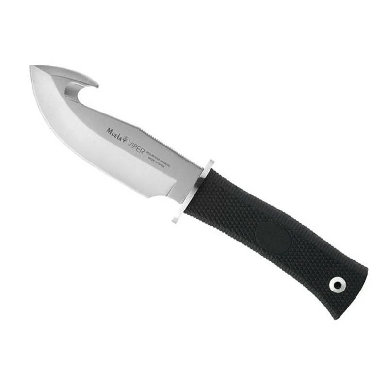 Ce poignard Muela Viper référence 9288 est parfait pour offrir aux chasseurs. En effet, il intègre une lame à dépouiller de 11cm de longueur fabriquée en acier inoxydable : en plus, elle est légèrement crantée sur le-dessus ce qui permet de dépecer encore plus facilement les animaux morts. La lame est marquée par le logo de la marque espagnole d’articles de chasse Muela ainsi que du texte Viper en référence au nom du poignard. De plus, une garde est présente pour que le chasseur puisse utiliser le couteau en toute sécurité. Au niveau du manche, il est conçu en gomme noire, un matériau qui confère au poignard Muela Viper une excellente ergonomie ainsi qu’un très beau design. Autre bon point, ce poignard pour chasseurs est livré avec son étui en cuir adapté : de quoi pouvoir le transporter facilement sans avoir peur de l’abîmer.
