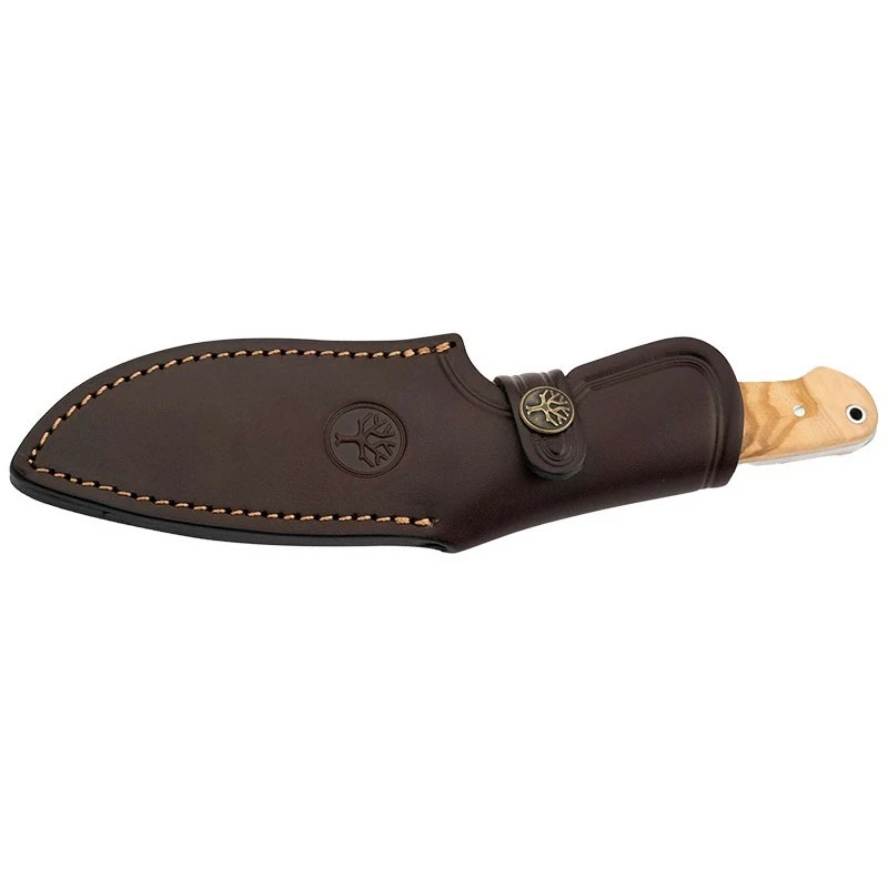 Le Vultur Böker est un couteau de chasse très attrayant qui est à même d’opérer des travaux de coupe demandant une grande netteté et finesse. Pour cela, il bénéficie d’une large lame Drop point parfaitement affûtée. Fabriquée en acier ACX390, elle est très résistante dans le temps. Sur la base de la lame se trouve une rainure qui permet d’y poser son index, ce qui vous mettra dans les meilleures dispositions possibles pour dépecer le gibier notamment. Les élégantes écailles du manche sont conçues en bois d’olivier : elles résistent très bien à la pluie et offrent une forte adhérence par tous les temps. Un trou pour dragonne avec un anneau en laiton est intégré dans la soie. L’étui en cuir fourni est doté d’une boucle de ceinture et d’un bouton-pression : il assurera votre intégrité physique lors du port et en même temps protègera le couteau.