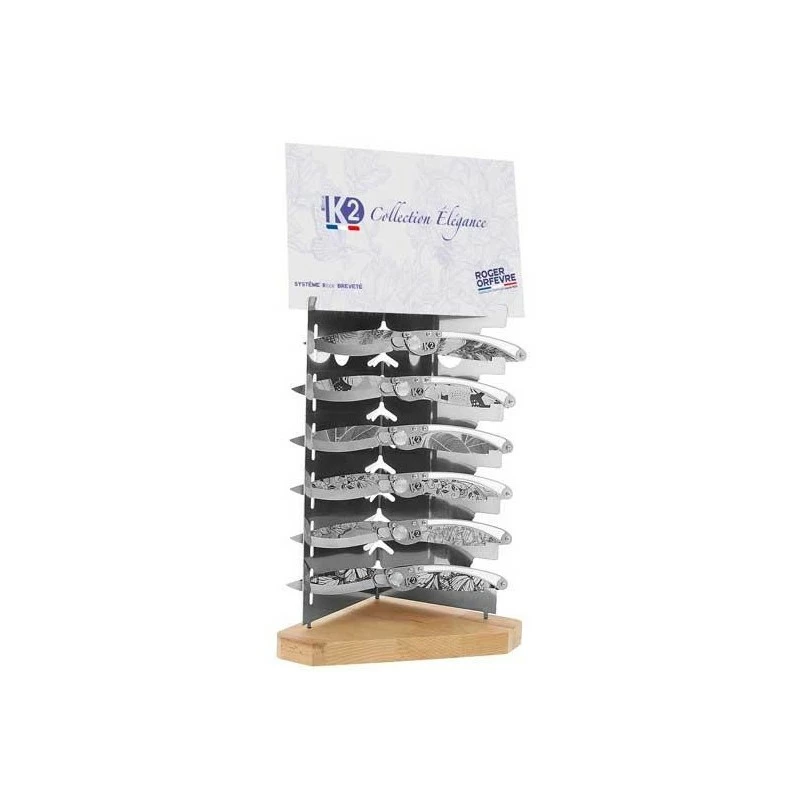 Ce beau présentoir permet de ranger jusqu’à 6 couteaux de poche K2, collection Élégance. Prenant quelque peu de hauteur, ils seront ainsi parfaitement mis en valeur.
