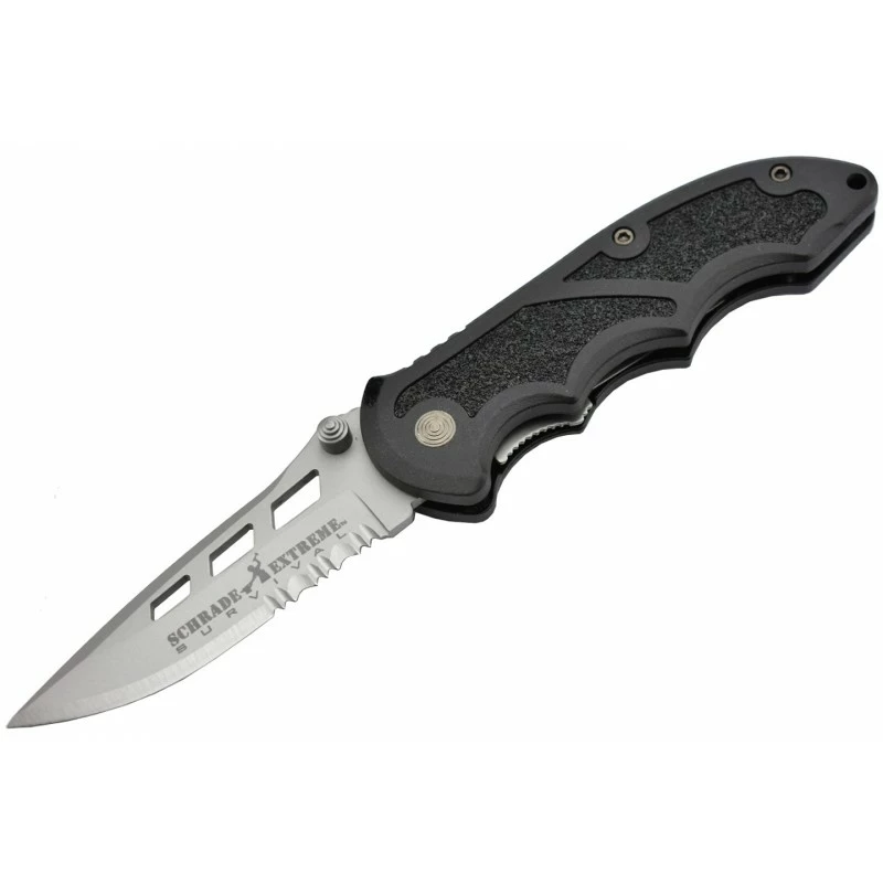 C’est un couteau liner lock à ouverture assistée possédant une lame de 85mm en acier inoxydable à la finition silver mat. Ajourée à trois reprises et décorée par le logo “Schrade Extreme Survival”, la lame bénéficie d’un tranchant mixte afin de s’adapter au mieux à toutes les situations possibles et imaginables. Le double thumb stud fait en sorte de pouvoir déployer la lame en toute simplicité.