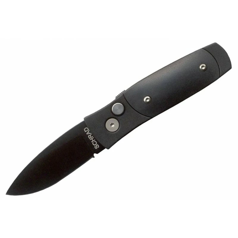 La lame du couteau automatique Schrade SMEDB s’ouvre à vitesse grand v, sous la simple pression du bouton positionné sur la poignée. Le manche est fabriqué en aluminium anodisé noir pour une résistance accrue. Longueur totale, en position ouverte : 152mm.