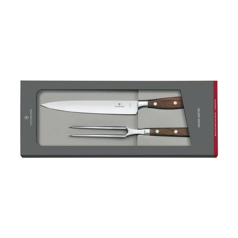 Un coffret d’exception, signé Victorinox, qui va faire les beaux jours des chefs de cuisine professionnels mais aussi des particuliers appréciant les viandes et volailles. Porteur de la référence 7.7240.2, ce service à découper contient 2 pièces, à savoir un couteau à découper ainsi qu’une fourchette appartenant à la série Grand Maître Rosewood de la célèbre marque Suisse. Cette gamme est caractérisée par des lames forgées en Allemagne, à Solingen, afin d’être plus résistantes, plus robustes, et par conséquent plus durables dans le temps. Les manches sont fabriqués en bois palissandre, rivetés pour un aspect plus moderne, et polis à la main avec toujours une très forte ergonomie afin d’assurer du confort à l’usage.