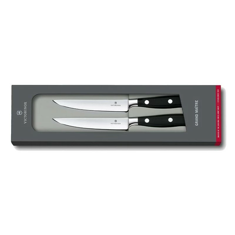 À table, c’est prêt ! Et pour déguster de la bonne viande, rien de mieux qu’un couteau à steak, ou plutôt deux couteaux à steak ! Car oui, ce coffret Victorinox Grand Maître 7.7242.2 contient 2 pièces adaptées à la découpe des viandes, que ce soit pour cuisiner ou au moment de manger. Les deux couteaux possèdent une lame au tranchant lisse, de longueur 12cm, en acier inoxydable, et surtout forgée, gage de qualité avec une solidité exceptionnelle. À noter que la forge est réalisée à Solingen en Allemagne, la lame est également embellie par le motif croix faisant référence à la marque Suisse Victorinox.