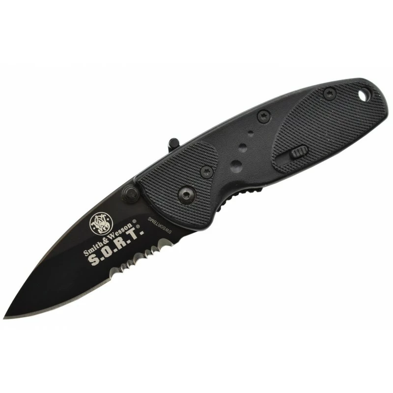 Le Smith & Wesson SWSORTBMS est un couteau pliant tactique au design intégralement noir. À ouverture assistée, sa lame au tranchant mixte de 65mm de longueur est fabriquée en acier 4034. Se verrouillant efficacement en position ouverte par le biais du mécanisme liner lock, elle intègre un double thumb stud facilitant les déploiements, aussi bien de la main gauche que la main droite (usage ambidextre). La lame noire est enrichie du logo Smith & Wesson ainsi que le texte “S.O.R.T” désignant le modèle du couteau. Le manche est quand à lui conçu en aluminium, toujours de couleur noire, en partie texturé pour une ergonomie accrue. D’une longueur de 95mm, ce dernier est doté d’un verrou de sécurité afin d’éviter que la lame ne s’ouvre de façon accidentelle. Le clip de poche ainsi que le trou de lanière assurent de leur côté une transportabilité sans faille.